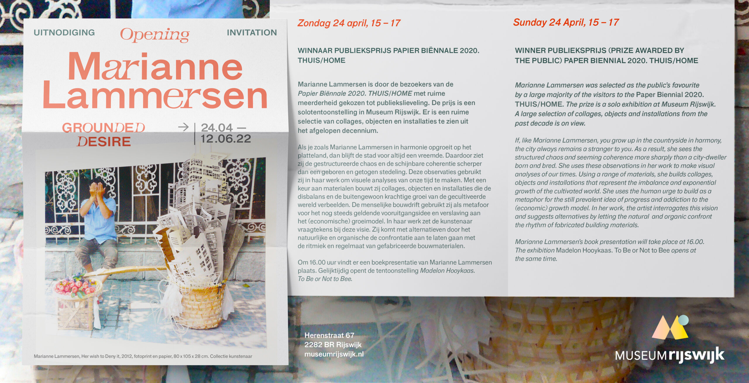 In 2020 is Marianne Lammersen (Nijland, 1984) door de bezoekers van de Papier Biënnale 2020. THUIS/HOME met ruime meerderheid gekozen tot publiekslieveling. De prijs is een solotentoonstelling in Museum Rijswijk. Van 24 april tot en met 12 juni 2022 is een ruime selectie van collages, objecten en installaties te zien uit het afgelopen decennium. Bij de tentoonstelling verschijnt een boek in gelimiteerde oplage, 160 pagina’s, 21 x 21 cm. Prijs: €25,=.