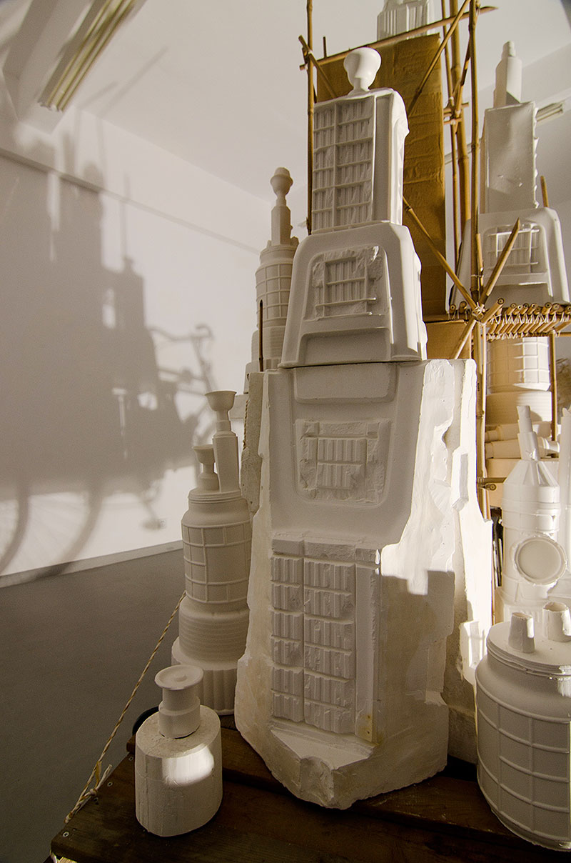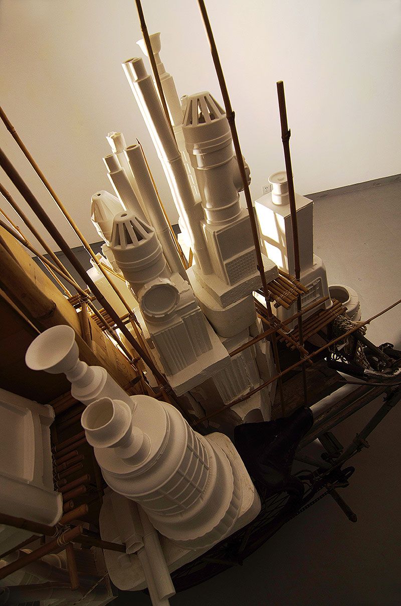 By showing the total process of ceramic casting; the mold, the rough casts, the cleaned casts, the boxes in which the porcelain would be transported, all kept together by a bamboo scaffolding, the work focuses on the buildingproces, the ongoing construction around us. This sculpture poetically suggests the struggle of the individual with the anonymized world of skyscrapers and simultaneously questions the displacement of traditional values by economic interests.