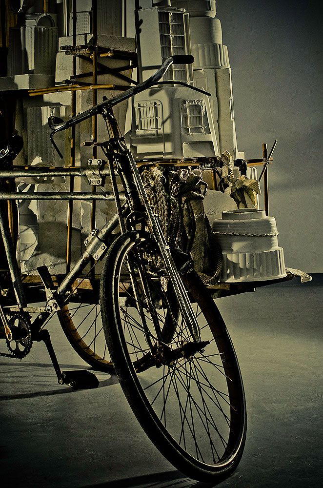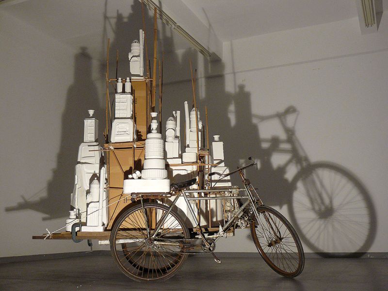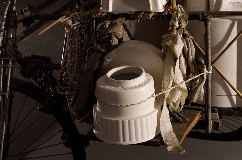 ‘Balancing on Trembling ground’ is an installation featering a cargo bike, that carries a city scape. The architectural shapes are composed of various everyday objects that are sold in mom-and-pop shops in the streets of Xiamen, cast in porcelain.