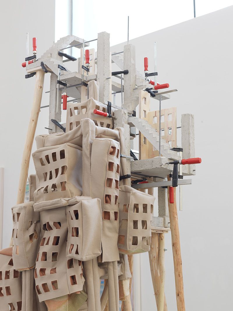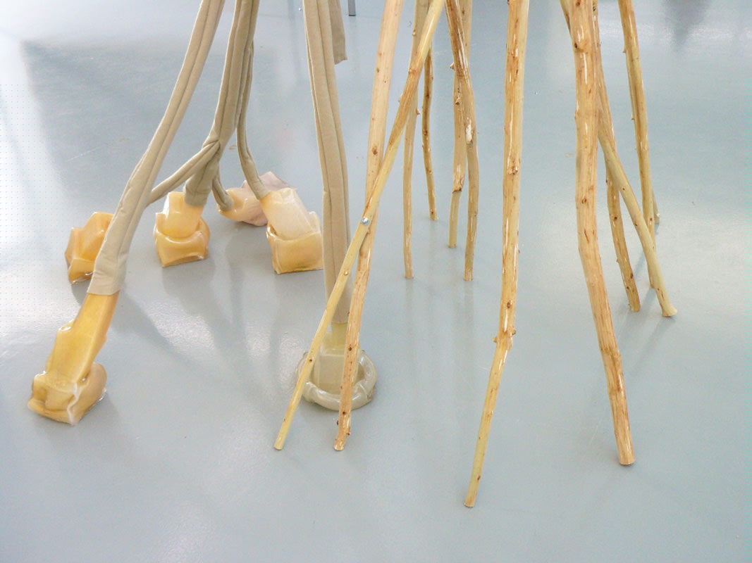 ‘Grounded Desire’ is an installation that speaks of the wish to reconnect to the ground we live on. A never-ending construction of concrete skeletonsof buildings (as encountered in Chinese suburbs) balance on high stilts. This movement upwards is countered by a more earthy/organic shape, that wants to connect to the floor. Placed high about the ground on willow branches and glass legs, the work breaths a speak of a precarious balance.