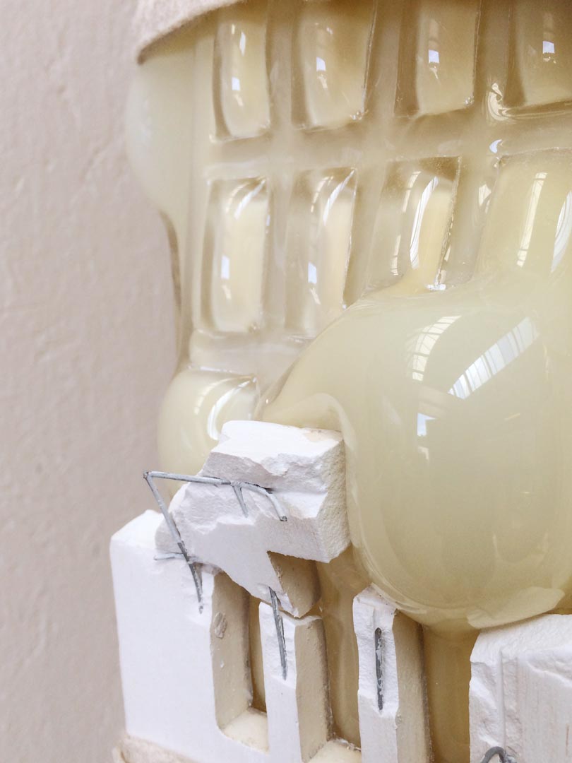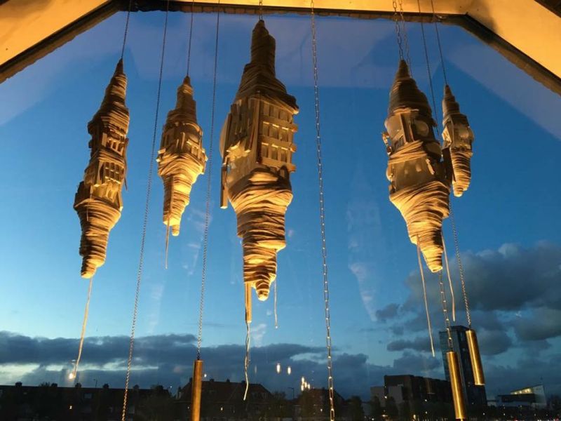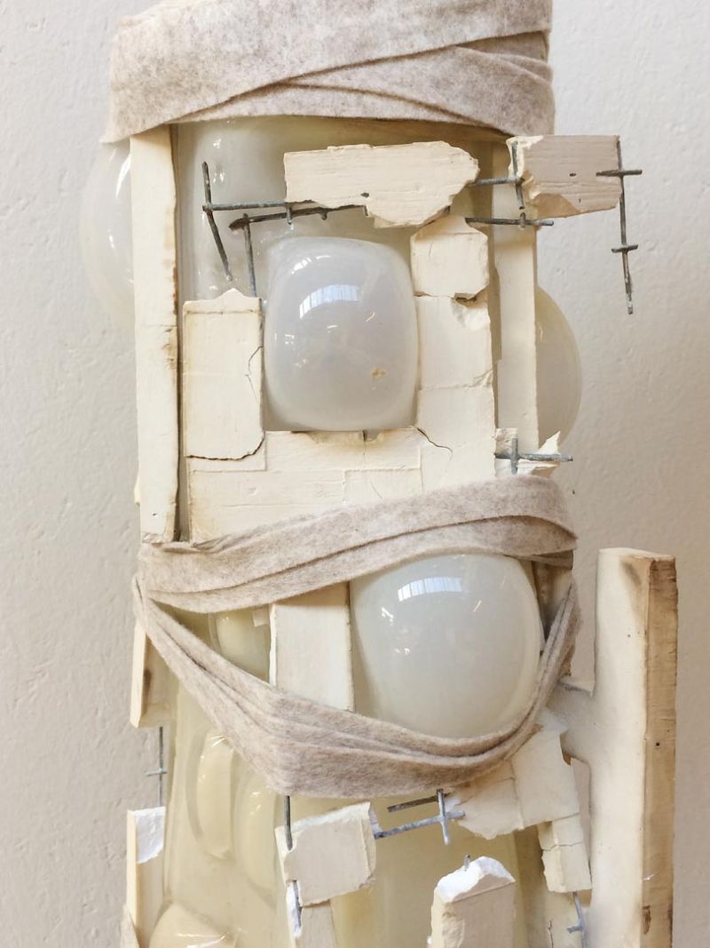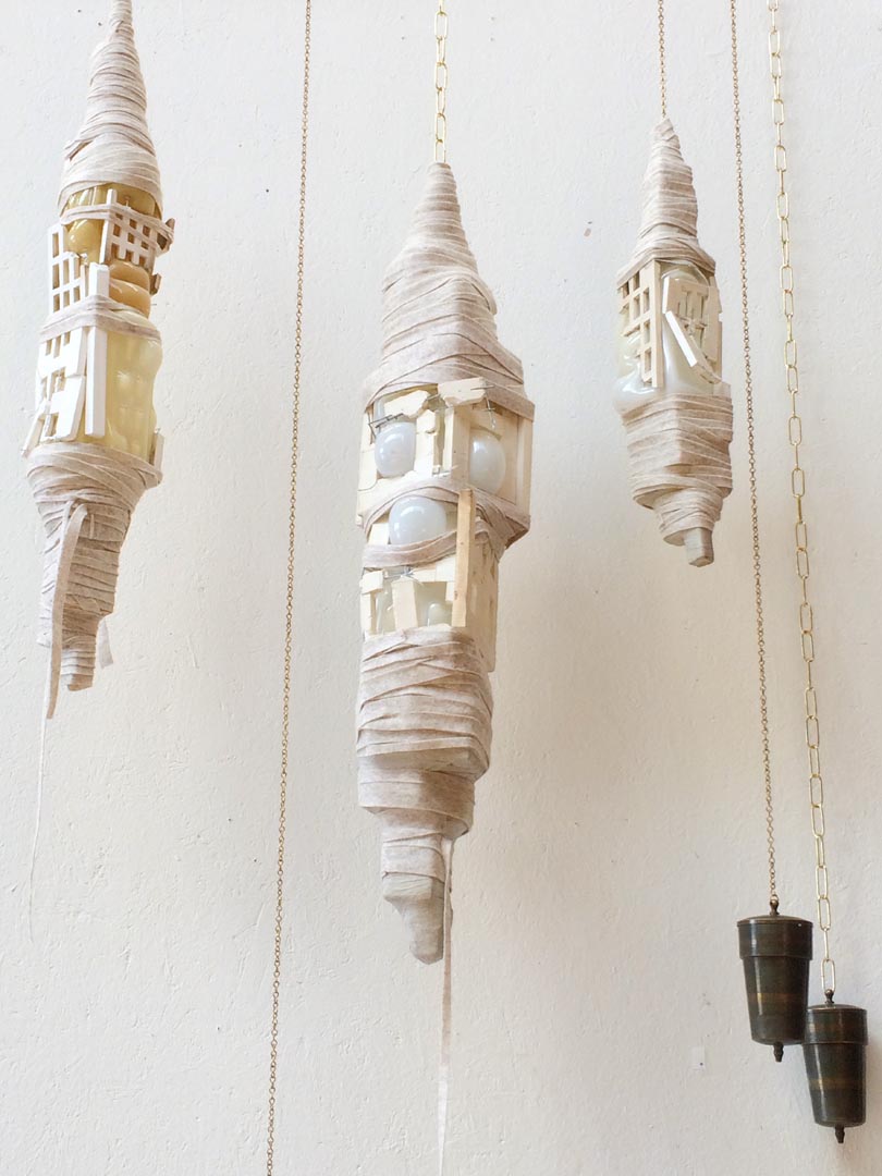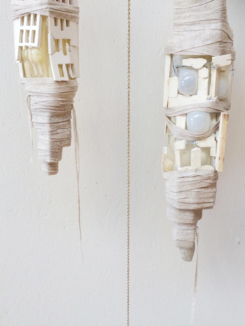 Cocoon-shaped objects hang in silence, as if they are about to emerge at any moment. The human made, architectural structures are breaking from inside out. Glass bubbles find their way. The material finds the path of least resistance. Existing structures are breaking, growingpains to a new reality, that is in continuous transition, where there is no time to settle in a new situation. Bell weights keep the cocoons in balance, reminding us that everything is a matter of time.