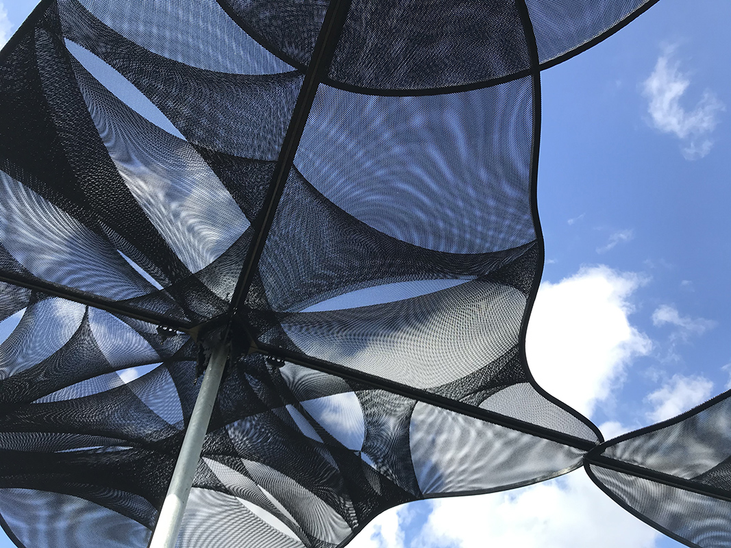 The mooring posts are positioned in such way that the skyline remains the same height. However, the water level, “set in motion” by the moiré effect, rises with each post, increasing its surface area, and gradually causes the buildings and their reflections to disappear. Visitors are invited to walk between the posts, to look up and experience the transition from high to low, or low to high tide. The increasing ‘water level’ blocks the sky and makes the buildings disappear. Walking in the other direction, the surface opens, and the skyline appears gradually. This sculpture was commissioned for the 2021 IJssel Biennial 2021.