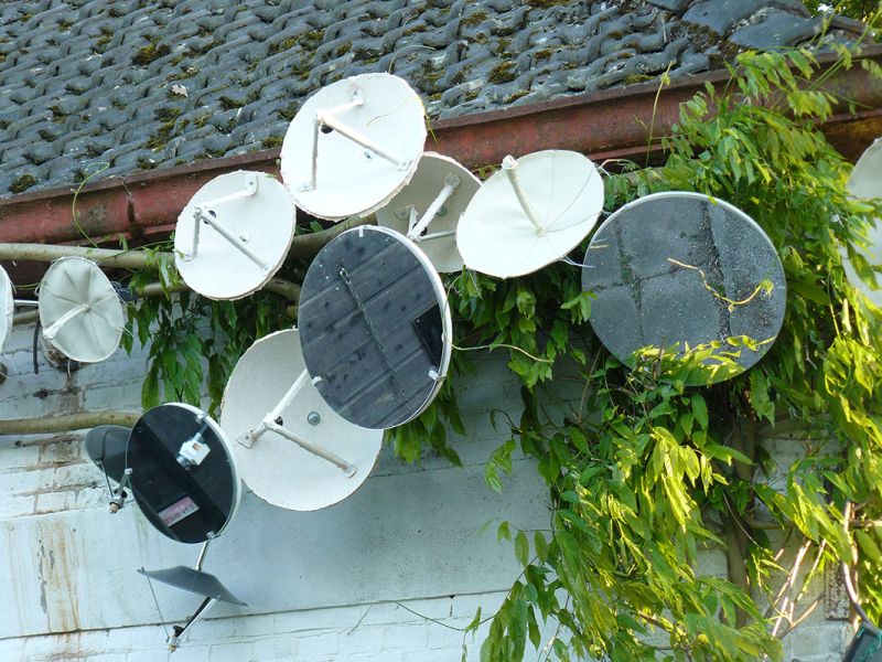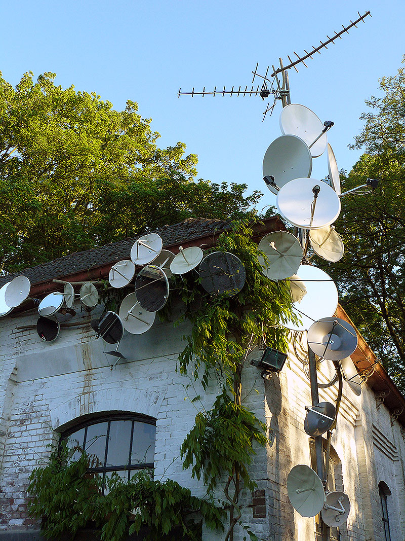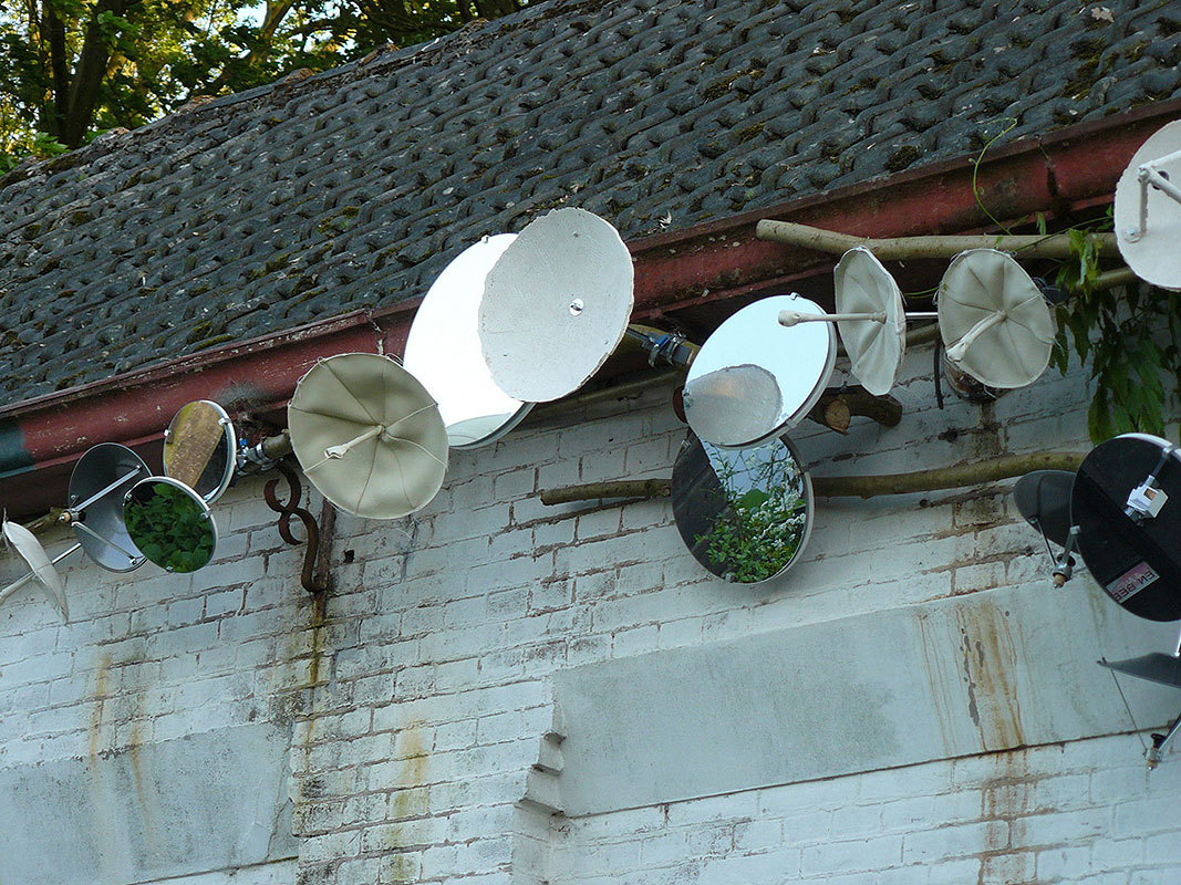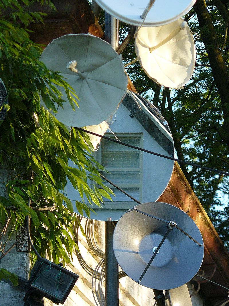 parabolic antennas, leather, metal, cables, branches, mirrors