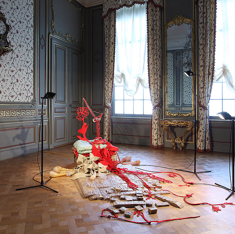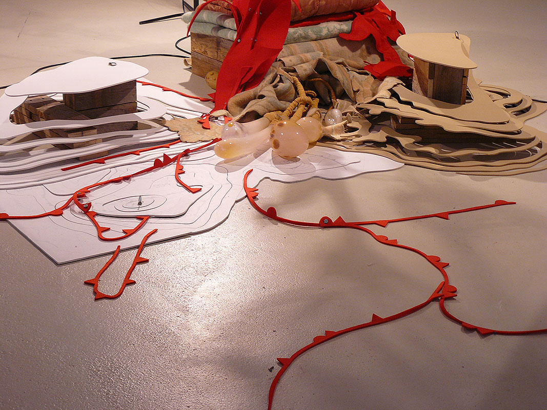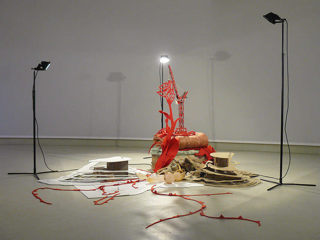 blown glass, textile, wood, lights, crane-toy, foam
