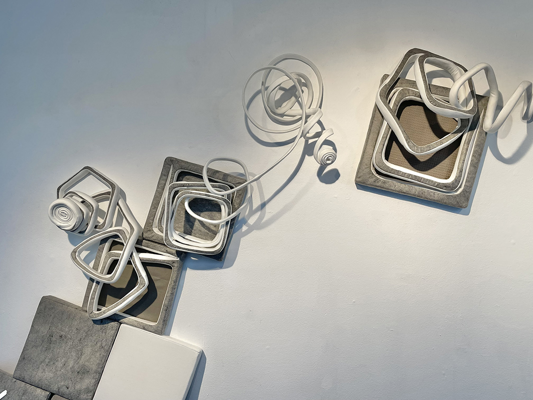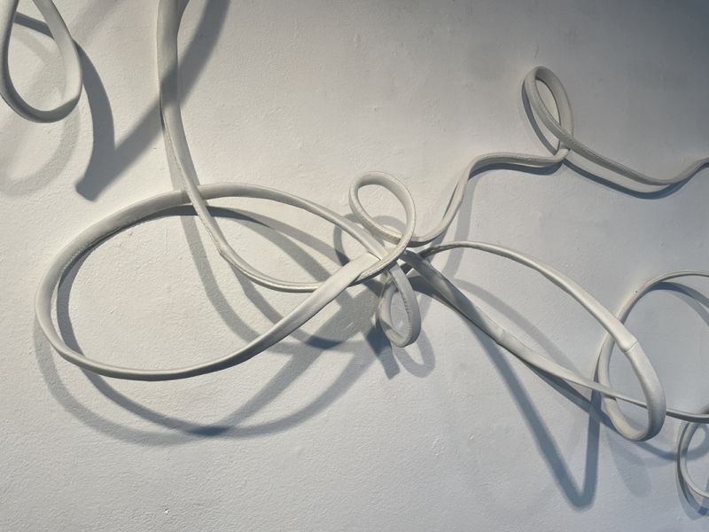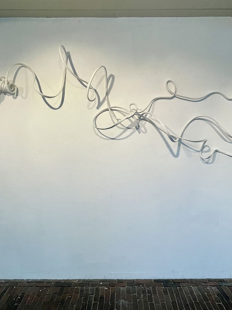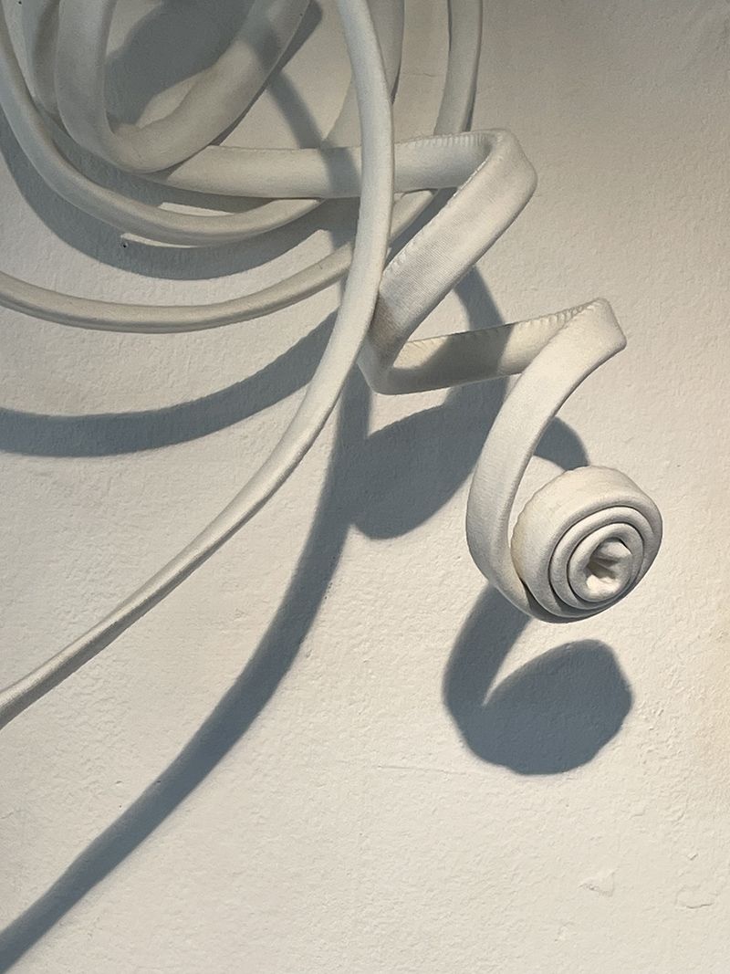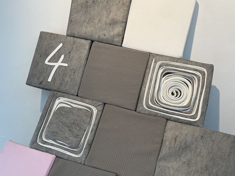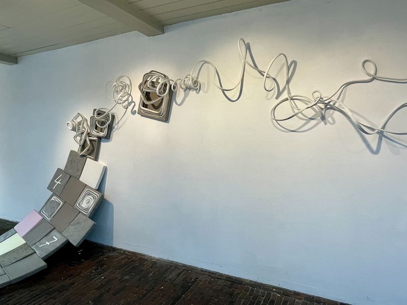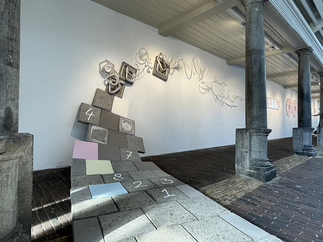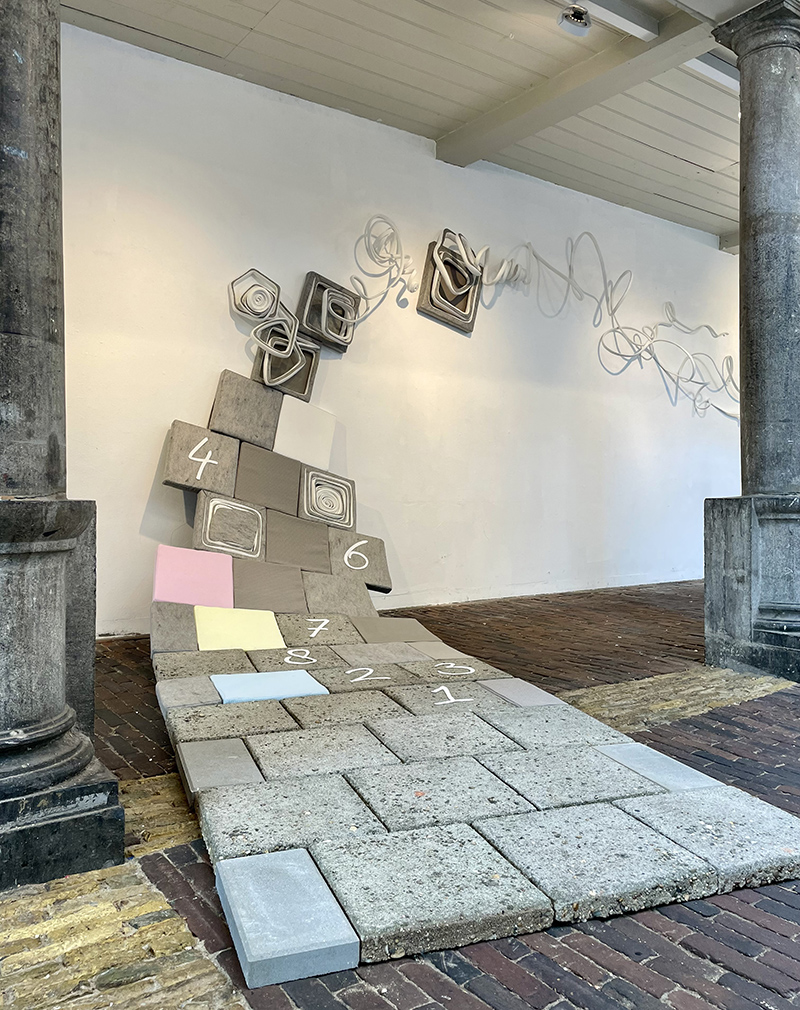 The installation ‘Towards Weightlessness’ depicts the beginning of a sidewalk, a path. The heavy concrete paving stones represent direction and efficiency. Gradually and playfully, they change meaning. ‘Direction’ becomes a place (hopscotch game) and a ‘efficiency’ a slowed-down pace (cushion). The tiles become lighter in material (fabric) and change shape (a spiral) and end in the weightless shadow of a line. Back to the meaningless, the (almost) nothing. In removing meaning or purpose, in destroying the symbol, the indeterminate is celebrated and responds to the desire to slow down.