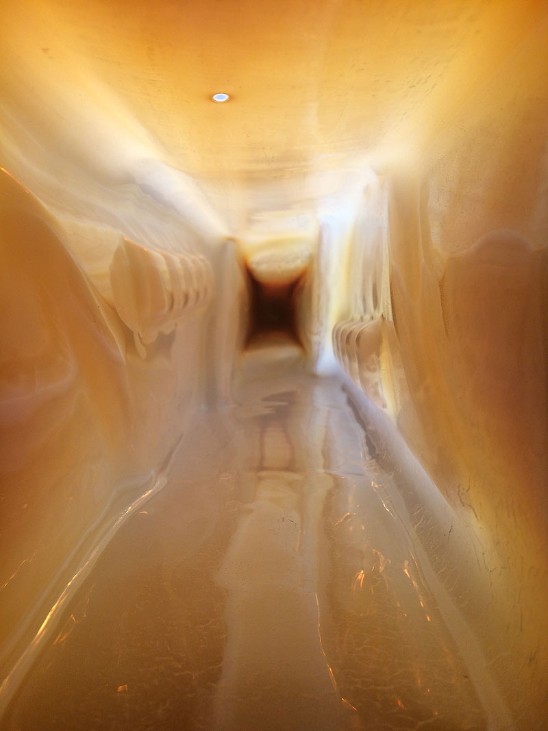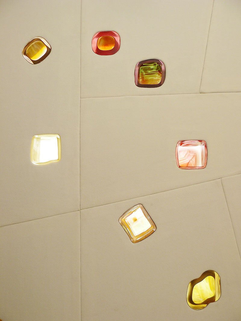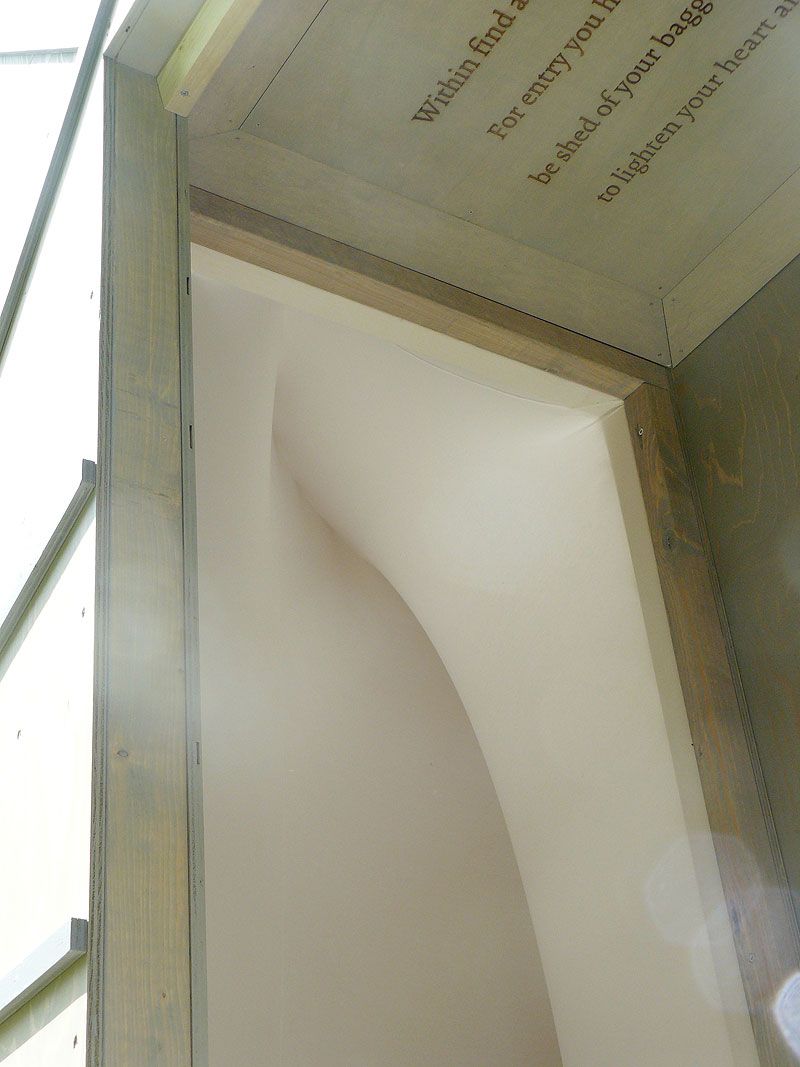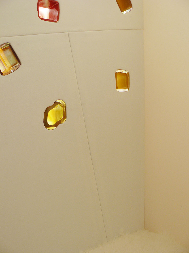 A city skyline, with it’s form and volumes relating to the horizon is flipped – literally – on its side. The skyline existing of scale models, abstracted from iconic buildings, are executed in glass. The result of these glass objects on the surface seem to resemble a hybrid of something man made and something that grows organic. But what is revealed to the public is not only the outside form, the true ‘escape’ will be experienced when entering the space, swirling into a light soft, organic space, where the your body is forced to touch the textile walls, to feel present. Arrived in the chapel-like space, your mind can escape again, looking through the ‘tunnels’ of glass, that reveal new insights and views.