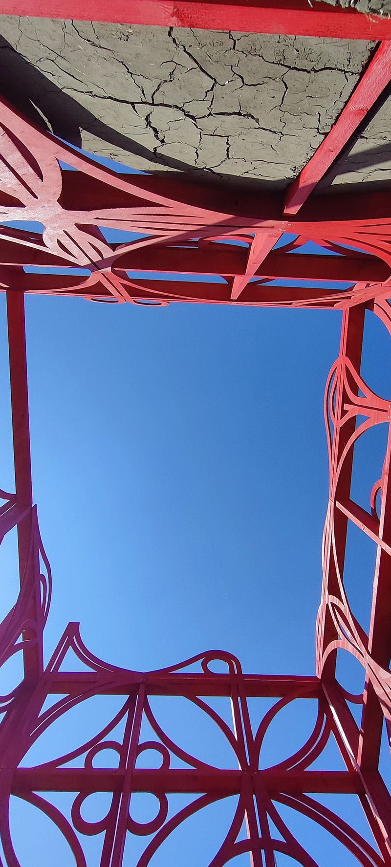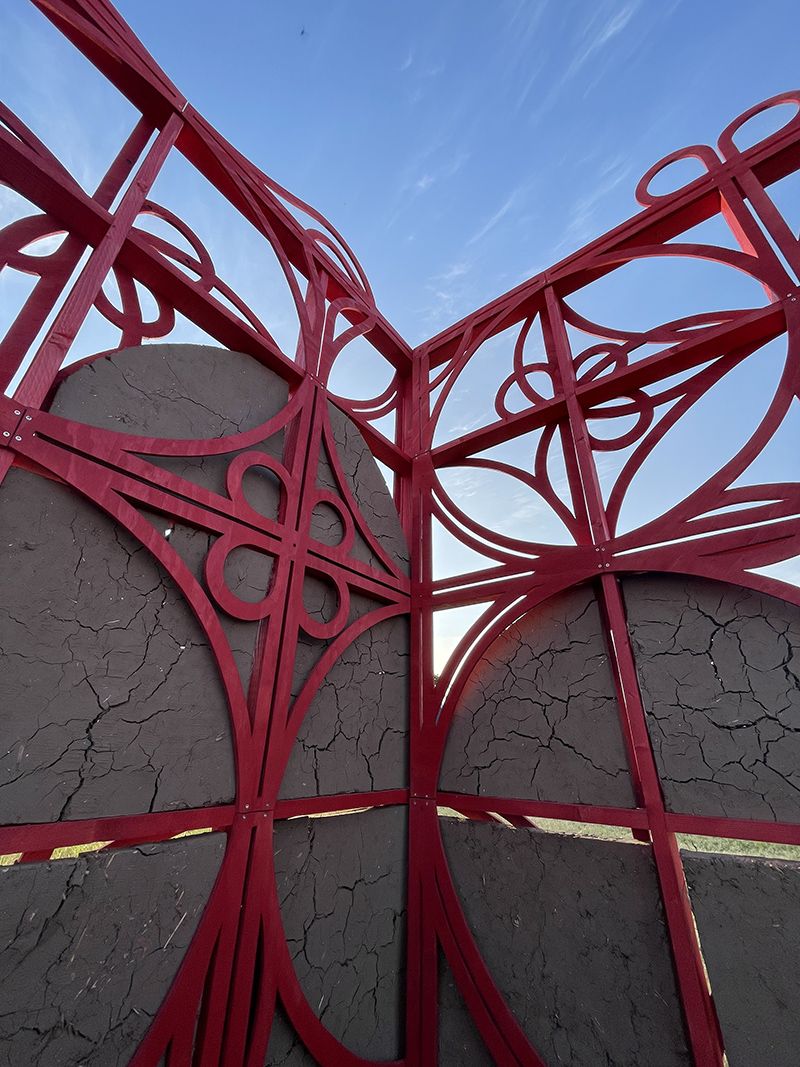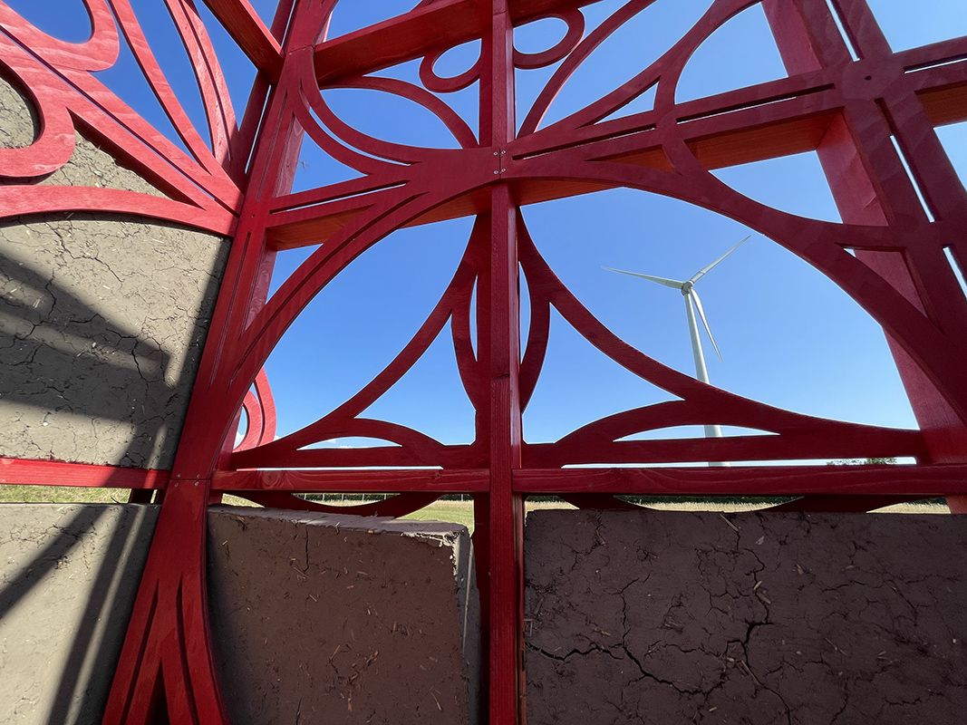 When the Observatory was build in the Dutch province of Flevoland in 1977, there was nothing but (new) land and sky. No highway, no train connection, no wind farm. These networks came later, and disrupted the emptiness that once was. For Which way forward inspiration was found in this development. Walls, formed by a grid of hightway junctions, form a space. This grid is filled with tiles made of local clay. The combination of clay and construction brings associations with (German) half timbering, a sheltered space to say. The visiter is invited to take a set, to ground, to reconnect with the earth beneath, and the empty sky above. The clay tiles themselves deform, by sun, rain, might crumble over time, and fall out of the framework. What remains is the networks of junctions, which encloses the visitors like a cage. The work plays with transitions from security to captivity, from connecting to the here-and-now to the tendency of always being on the way to what’s next.